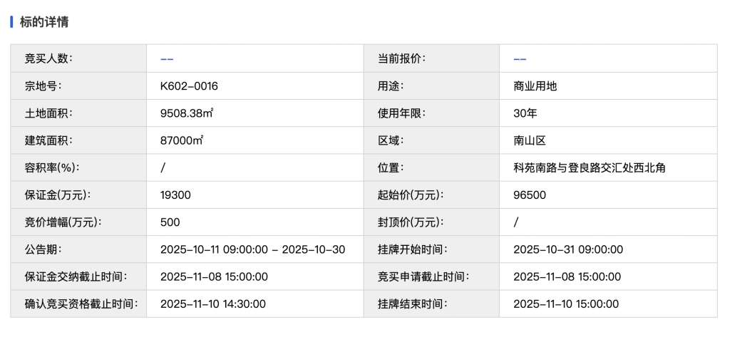 从地块出让信息来看,此次出让地块的宗地号为K602-0016,地块位于南山区粤海街道科苑南路与登良路交汇处西北角,土地用途为商业用地,总用地面积9508.38平方米,挂牌起始价9.65亿元。出让宗地须自《出让合同》签订之日起1.5年内开工,3.5年内竣工。