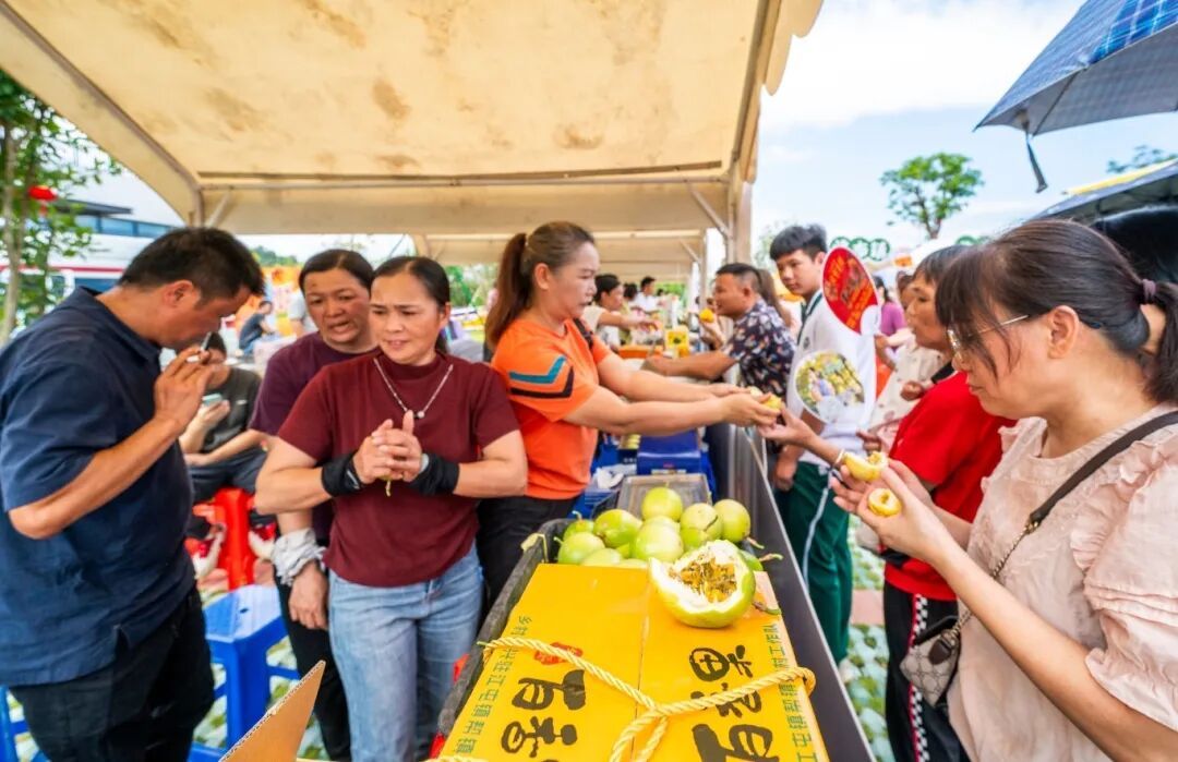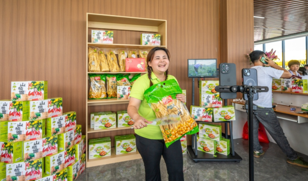 直播带货区的主播们忙得不亦乐乎,对着镜头展示各镇特产:“家人们,广宁木格山楂面弹牙、潭布山水腐竹爽滑今天下单包邮到家!” 镜头内外的热情互动,让丰收的喜悦传向更远的地方。