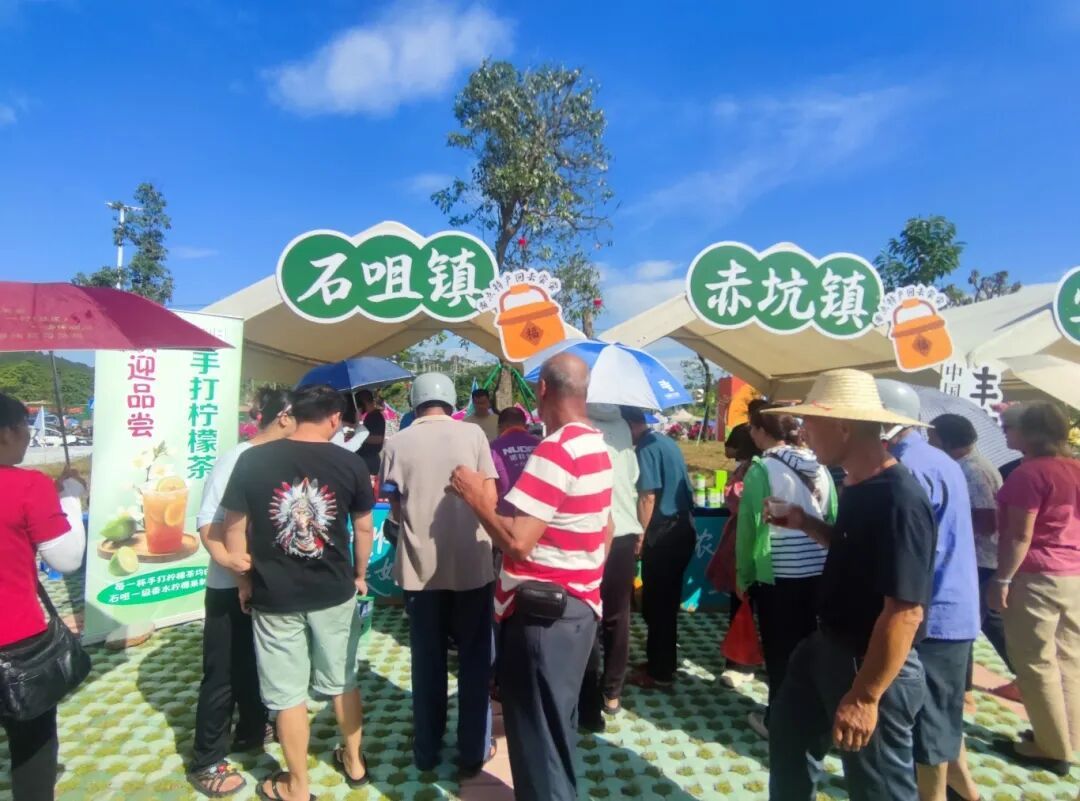 北市镇的柠檬红茶展位前,不仅能免费喝茶,还设置了“发朋友圈领文创礼包”互动游戏,尤其是文创包一背上,就成了丰收节最显眼的“时尚单品”;最生猛的当属石咀镇,水箱里的“倒刺鲃” 活蹦乱跳,工作人员一边介绍“这鱼肉质紧实,煮汤最鲜”,一边帮选购的群众打包,不少人冲着“新鲜”直接下单。