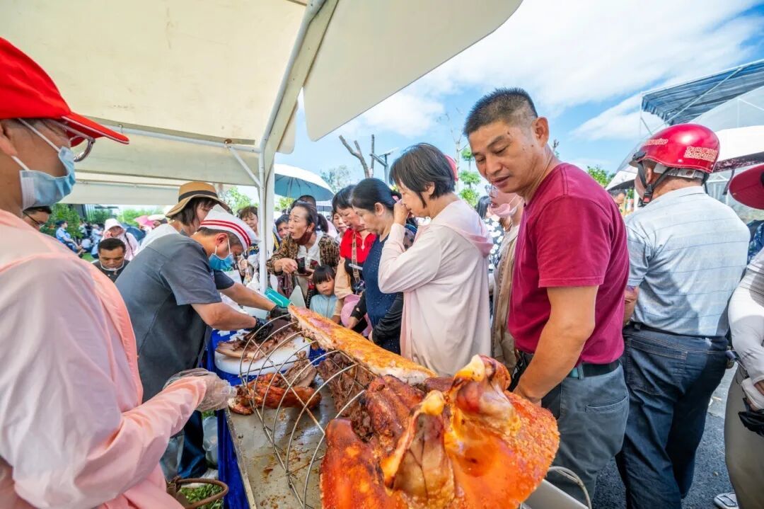 肉香区里,作为丰收节打卡必吃榜“TOP1”当然是——“广宁云吞”!而在特色美食展示区,“广宁有礼”各式口味的乳鸽现场开煮,香气四溢。古水镇的烧肉皮脆肉嫩,每一口都食过返寻味。宾亨镇的月饼展位前更是排起了长队,这个有着72年历史的老品牌,推出了莲蓉、伍仁等经典口味,年产百万只,承载着无数人的乡愁记忆。
