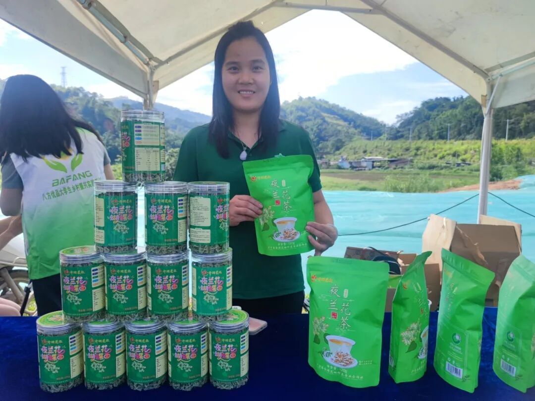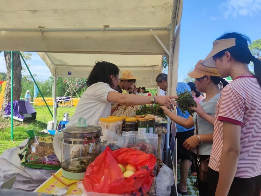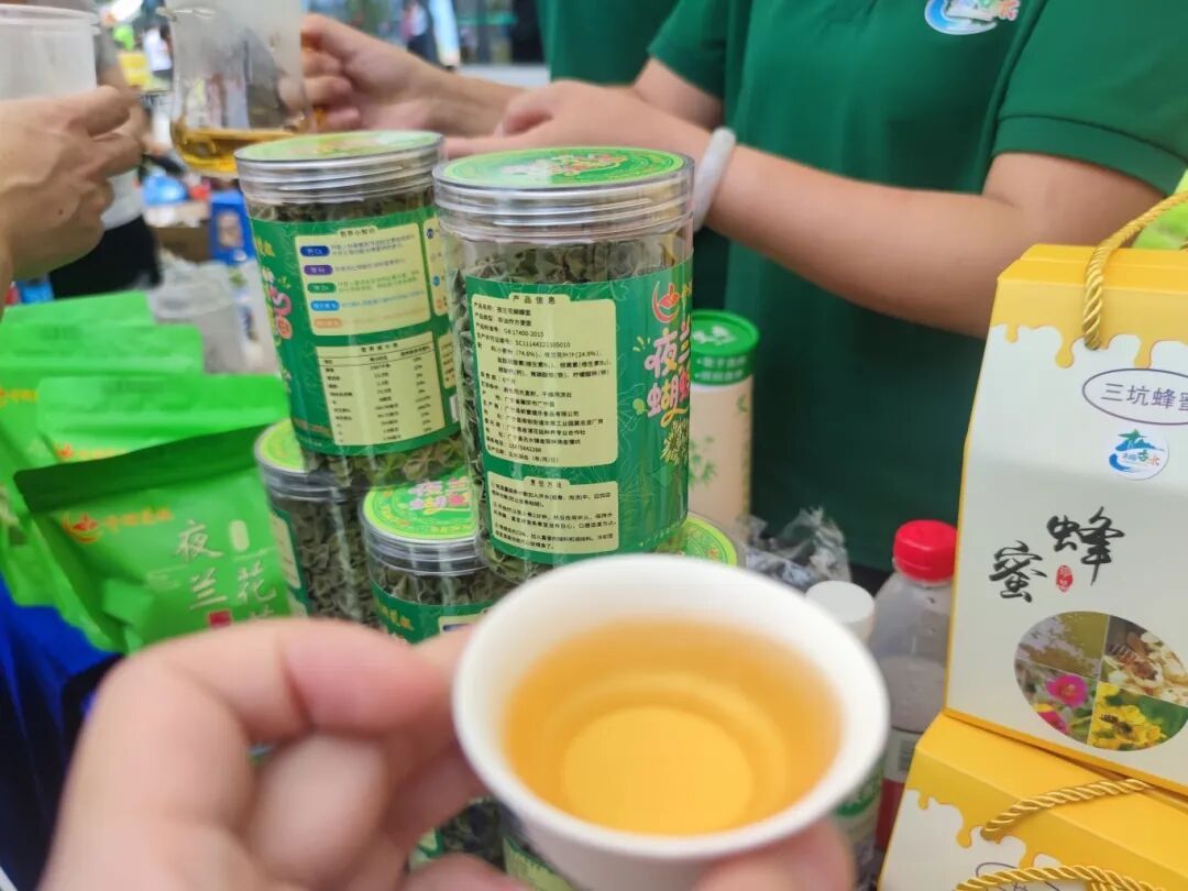 茶香区更是热闹非凡,五和镇的沉香茶香气独特,赤坑镇的砂仁茶带着温润的药香—— 据介绍,砂仁茶有化湿开胃、温脾止泻的功效,是当地养生佳品;螺岗镇的夜兰花茶格外抢眼,这种夜间香气更浓郁的花朵制成的茶,混合了淡竹叶、桂花等辅料,口感清甜;江屯镇的单丛茶来自1200亩生态茶园,古法炭焙工艺让茶汤醇厚回甘,成为茶客们的心头好。