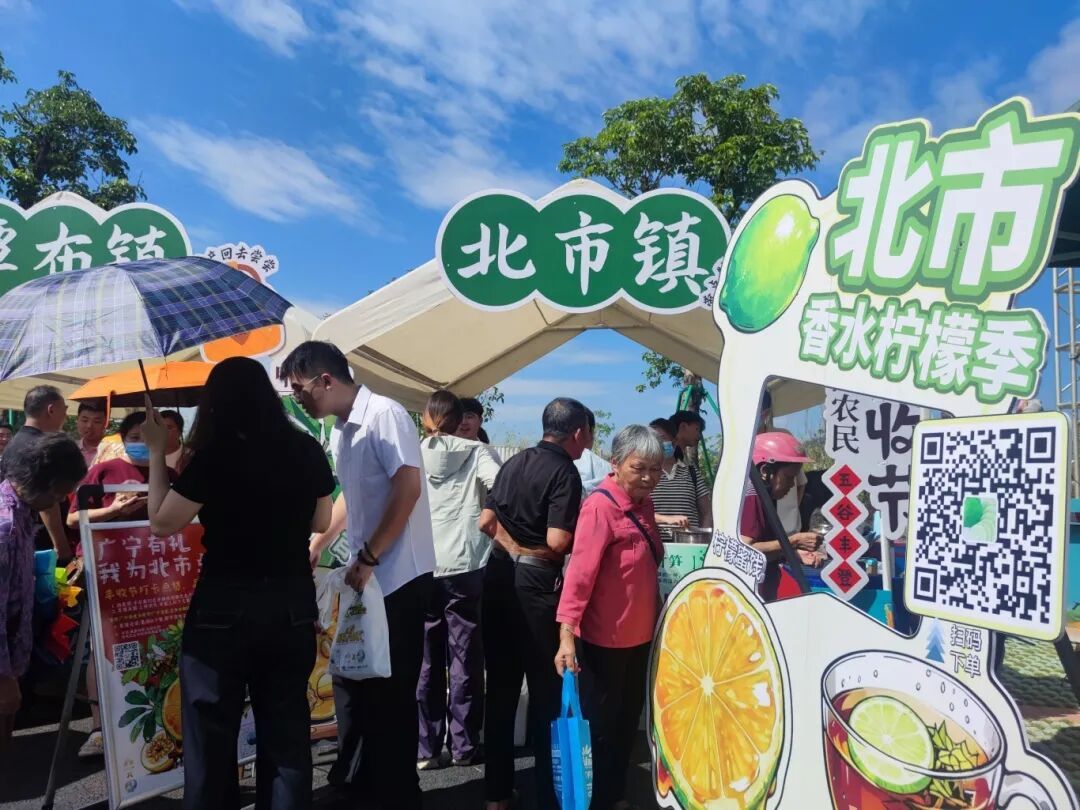 果香区里,古水镇、石咀镇的香水柠檬香气扑鼻,试吃台前围满了人;江屯镇的百香果蜂蜜香甜浓郁,木格镇的百香果曲奇酥脆可口,“大人不做选择,两样都要带回家!” 一位阿姨的话道出了大家的心声。