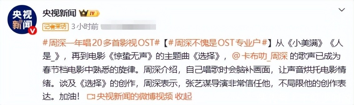 “周深一年献唱超20部影视原声”“OST领域标杆人物”