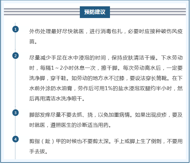 台风发生过后,尤其是内涝积水长期不退的地区,皮肤病的发病率较高,主要是人体四肢由污水浸渍、昆虫叮咬等多种原因引起的皮肤炎性感染。台风天或在台风后的救灾过程里容易发生外伤,伤口会因接触到积水中的污物和病菌容易出现感染。脚被雨淋,或者长时间浸泡在地面积水中,可加速真菌繁殖,容易造成浸渍性皮炎、皮肤湿疹和手足癣等皮肤病。